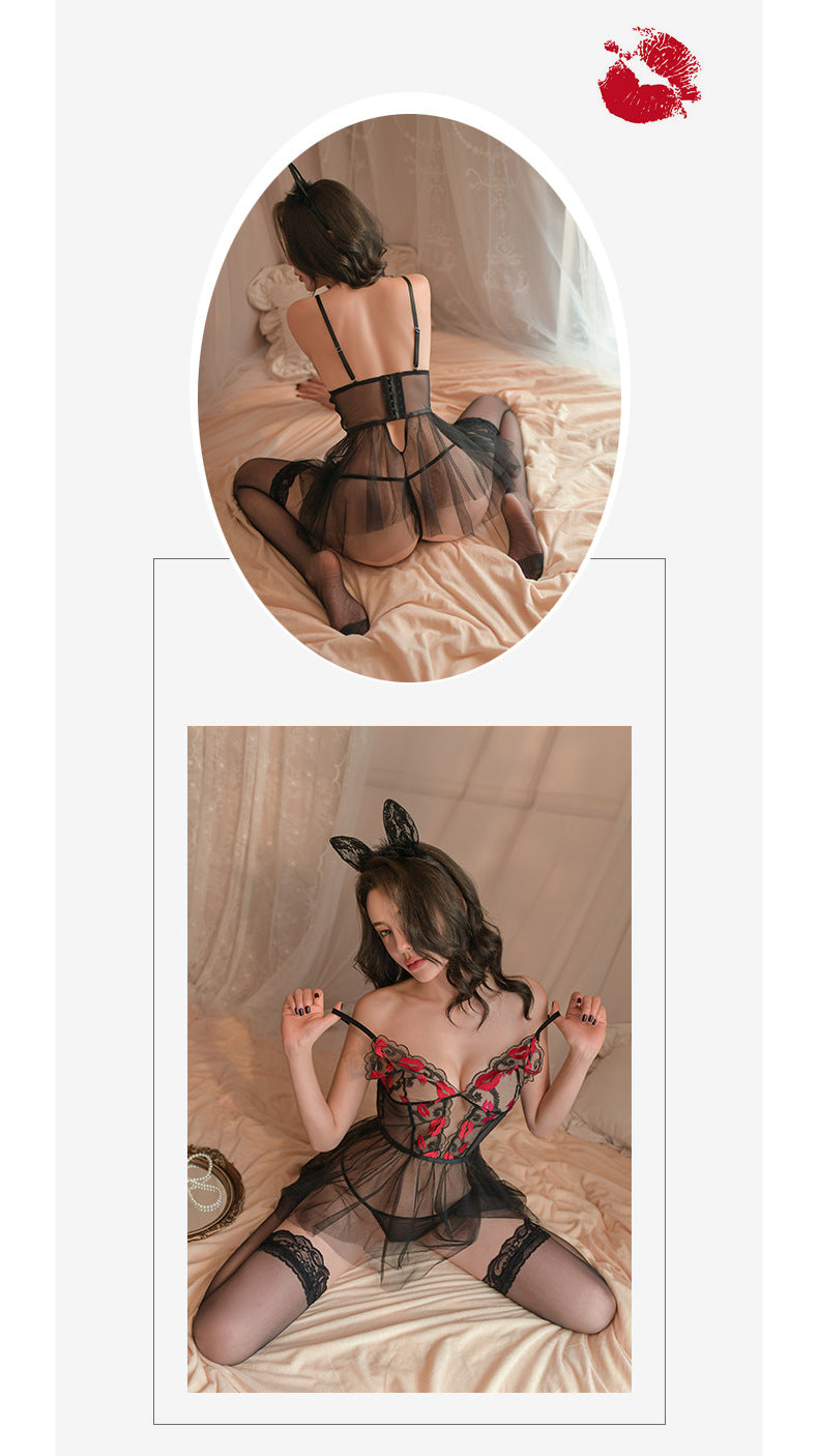 New sexy black transparent mesh lip print printed camisole nightdress lingerie set